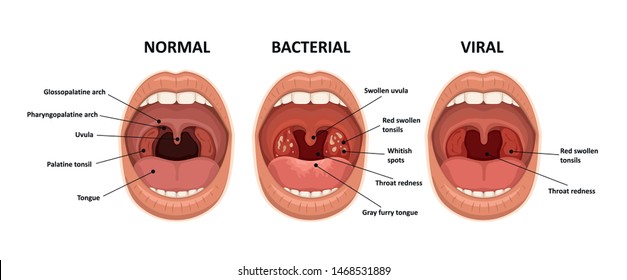 ပါးစပ်ဟခိုင်းရင် နီရဲ-ရောင်နေတဲ့ အာသီး တဖက်ဖြစ်ဖြစ် နှစ်ဖက်လုံးဖြစ်ဖြစ်မြင်ရမယ်။ မျိုရမဲ့လမ်းကို ကျဉ်းရာကနေ ပိတ်လုလုအထိ ကြီးနေနိုင်တယ်။ ရက်တို ရောင်ရာကနေ ပြည်တည်နိုင်တယ်။